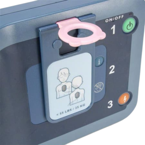 De Philips FRx baby-/kind-sleutel maakt uw AED direct geschikt voor pediatrische slachtoffers. Door het insteken van de sleutel verlaagt de AED automatisch de energieafgifte naar 50 Joule. Zo kunt u veilig reanimeren bij kinderen jonger dan 8 jaar of lichter dan 25 kg, zonder aparte kinderelektroden.